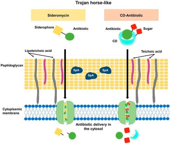 Trojan-horse-like strategy. Siderophores or sugar-crafted cyclodextrins can facilitate antibiotic delivery through the uptake by their specific siderophore or sugar transporters in the cytoplasmic membrane and subsequent release of the antibiotic in the bacterial cytoplasm.