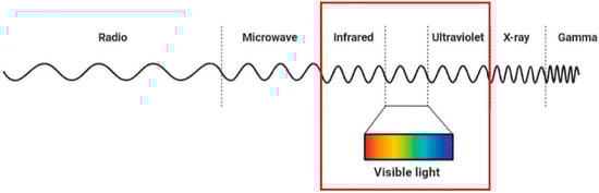 Phototherapy or “light therapy” is a medical treatment in which natural or artificial light is used to improve a health condition. In his work entitled The history of phototherapy: something new under the sun?, Roelandts, R. describes the hallmarks in the history of phototherapy []. One of the first reports of sunlight being used to treat infections (heliotherapy) is from 1400 BC, in which people with vitiligo were treated with some plant extracts and then exposed to the sun []. Since the 19th century, many advances have been made in the field. Heliotherapy was used for the treatment of peritoneal tuberculosis, rickets, and lupus vulgaris []. Over the years, it was discovered that part of the bactericidal effects could be attributed to the blue–violet region of the solar spectrum, and that oxygen was necessary for those effects []. The knowledge of the role of UV rays in the therapeutical effects of the light led to the development of artificial sources of light, which led to the initiation of phototherapy. The region of the electromagnetic spectrum emitted by the sun that is used for phototherapy treatments is depicted in Figure 5. It has been demonstrated that UV, visible light, and infrared rays are able to kill S. aureus. UV and violet–blue wavelengths produce photochemical effects, whereas infrared rays produce photothermal damage [,,]. Depending on the wavelength, the dose, the duration, the frequency of the exposure, and the presence or absence of exogenous agents such as photosensitizers, phototherapy can lead to either the inactivation of microorganisms or their death.