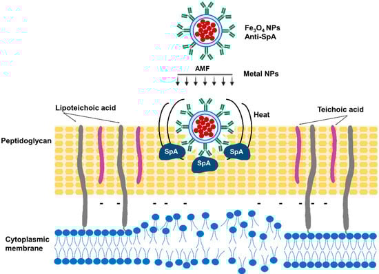 S. aureus-targeted magnetic nanoparticle hyperthermia. Magnetite (Fe3O4) coated with streptavidin and a biotinylated anti-protein A (SpA) antibody (anti-SA) binds to the S. aureus cell wall, and the alternating magnetic field (AMF) can induce thermal inactivation.