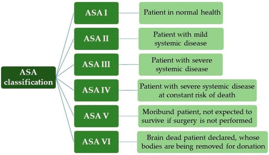 For the surgical risk classification, the anesthetic risk categories and the physical status classification according to the American Society of Anesthesiologists (ASA) were used, an important reference for the pre-anesthetic evaluation of the patient [,]. Thus, it is used in several studies due to its close relationship with anesthetic morbidity and mortality, as shown in Figure 1.