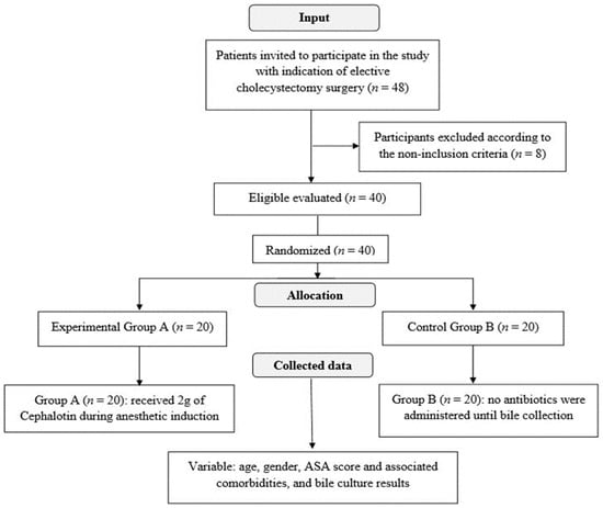 The selected patients were randomly divided into 2 groups: Group A (n = 20), which received 2 g of Cephalotin (1st generation cephalosporin, Keflin®, ABL antibiotics do Brasil Ltd., Cosmópolis, Brazil) [,] during anesthetic induction, and Group B (n = 20) where no antibiotics were administered until bile collection.