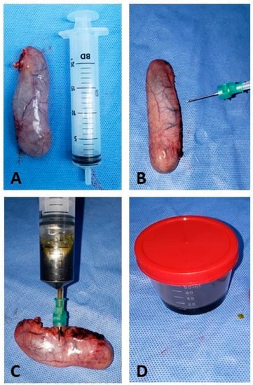 The bile collection procedure was performed in a sterile bottle right after the removal of the gallbladder from the abdominal cavity, as shown in Figure 3.
