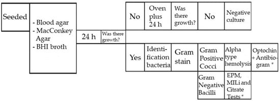 The flask containing the bile was sent to the Laboratory (Laboratório São Francisco, Marília, Brazil), where the bile was seeded on Blood Agar, MacConkey Agar and BHI Broth (Brain Heart Infusion) and incubated for 48 h, according to the standard operating procedure (Figure 4).