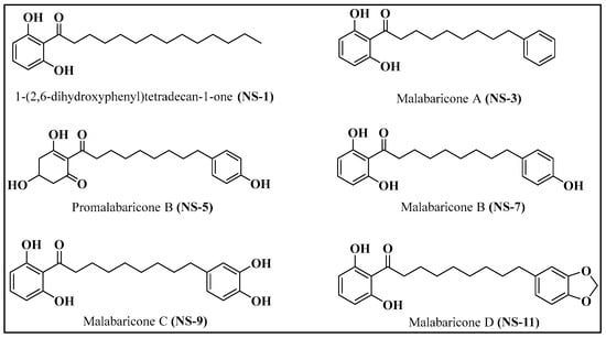 The isolates from M. malabarica (Figure 1) were identified as the known chemical constituents, namely 1-(2,6-dihydroxyphenyl) tetradecan-1-one (NS-1), malabaricone A (NS-3), promalabaricone B (NS-5), malabaricone B (NS-7), malabaricone C (NS-9), and malabaricone D (NS-11), by interpreting their1H NMR, 13C NMR, and HRESI-MS spectroscopic data (available in the Supplementary Materials) and by comparing the results with relevant data from the literature.