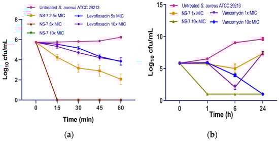 Bacterial time–kill kinetics of NS-7 and comparators against S. aureus ATCC 29213 for (a) 1 h; (b) 24 h. The bacteria were incubated with various MICs for 24 h, then samples were removed at specified time intervals and the CFU was determined. The error bars indicate the standard deviations (SDs) derived from triplicate samples of each tested antibiotic or compound.