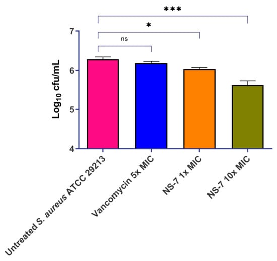 Activity of NS-7 and comparators against intracellular S. aureus ATCC29213 in J774.A1 mouse macrophages. The error bars indicate the standard deviations (SDs) derived from triplicate samples of each tested antibiotic or compound. * (p < 0.5) and *** (p < 0.05) denotes significance.