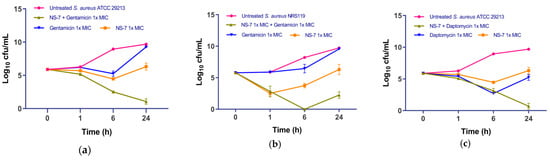 Recent advances in combination therapy to defeat MDR S. aureus infections emphasize the need to evaluate the synergistic interactions of a newly developed antibacterial agent with conventional antibiotics [21]. As such, the potential synergistic interactions between NS-7 and clinically used antibiotics against S. aureus ATCC29213 were evaluated by determining the fractional inhibitory concentration (ΣFIC) using the checkerboard assay [22]. Among the tested antibiotics, NS-7 showed synergistic interactions with gentamicin and daptomycin (FIC 0.265, Table 5). Furthermore, the bacterial killing kinetics of the active combinations were assessed in order to confirm the synergistic interactions. At 1X MIC against S. aureus ATCC 29213, NS-7 + gentamicin caused a significant reduction in cfu/mL, better than either drug alone (Figure 5a), with the complete eradication of all culture in 24 h. When tested against gentamicin-resistant MRSA NRS 119 (Figure 5b), the combination of NS-7 + gentamicin fared better than the individual drugs, with maximum activity achieved after 6 h of treatment (~8.2 log10 cfu/mL reduction as compared to untreated) with slight regrowth observed at 24 h. The combination of NS-7 + daptomycin also performed better than either drug alone at 1X MIC and resulted in a ~9 log10 cfu/mL reduction in S. aureus ATCC 29213 (Figure 5c) in comparison to untreated control growth after 24 h. The results revealed that the antibacterial potential of NS-7 can also be successfully employed with gentamicin and daptomycin to attain the augmented activity, even against gentamicin-resistant MRSA.