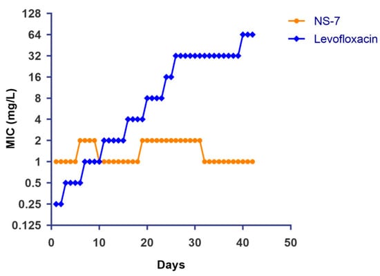 S. aureus ATCC29213 was subjected to 40 days of serial passaging in the presence of subinhibitory concentrations of NS-7 and levofloxacin to induce resistance. The changes in MIC were monitored every third passage and plotted against the number of passages, and the fold increase in MIC was calculated as previously described [43].