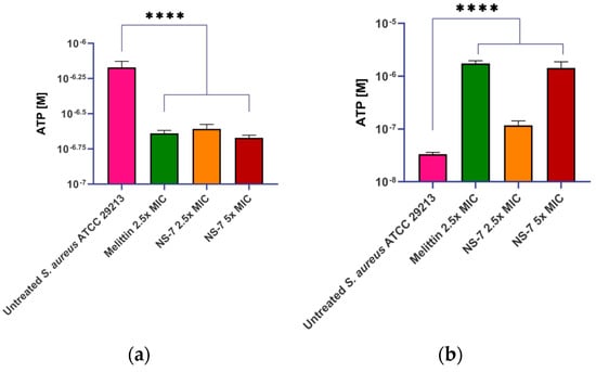 Treatment with NS-7 leads to (a) intracellular ATP decrease; (b) extracellular ATP increase in NS-7 treated S. aureus ATCC 29213. Melittin was used as the comparator. The error bars indicate the standard deviations (SDs) derived from triplicate samples of each tested antibiotic or compound. **** (p < 0.005) denotes significance.