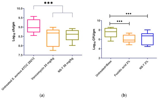 In vivo efficacy of NS-7 and vancomycin in a murine model: (a) neutropenic thigh infection; (b) skin infection model. The error bars indicate the standard deviations (SDs) derived from triplicate samples of each antibiotic or compound treatment group tested in three independent experiments. *** (p < 0.05) denotes significance.