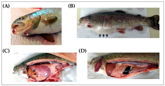 Clinical signs of Yersinia ruckeri infection in rainbow trout (Oncorhynchus mykiss). Presence of subcutaneous hemorrhages in the oral cavity (A, white asterisks) and abdominal distension (B, black arrows). Internal lesions related to Yersiniosis included the presence of petechiae in the liver (C, black arrows) and enlarged spleen (D, white # symbol).