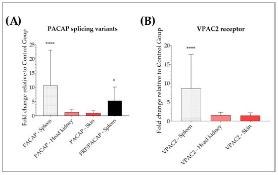 Relative expression of cDNA encoding for rainbow trout PACAP, PRP/PACAP, and VPAC2 was assessed in Y. ruckeri-infected fish and compared with healthy control fish by qRT-PCR. An up-regulation of PACAP was observed in the spleen of naturally infected trout, with a 15-fold increase relative to the expression level in healthy trout (p < 0.0001) (Figure 3A). No significant differences were found in the head, kidney, or skin (p > 0.05, respectively). For the gene encoding PRP/PACAP, as shown in Figure 3A, a significant up-regulation was seen in the spleen, with an increase of 2-fold (p < 0.05). However, no expression of the gene of interest was detected in the head, kidney, or skin of naturally infected fish or healthy controls. Also, the natural infection with Y. ruckeri provoked a significant up-regulation of the VPAC2 receptor in the spleen, with a 5-fold increase in naturally infected trout relative to the expression level in healthy trout (p < 0.0001) (Figure 3B). No significant differences in VPAC2 mRNA levels were found in the head, kidney, and skin (p > 0.05, respectively).