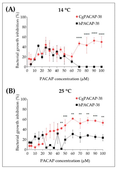 The direct antimicrobial activity of synthetic Clarias gariepinus PACAP-38 (CgPACAP-38) and human PACAP-38 (hPACAP-38) against Y. ruckeri was assessed by a broth microdilution peptide assay in Tryptic Soy Broth (TSB). We tested the minimal inhibitory concentrations of both PACAP-38 versions at 14 and 25 °C (Figure 4). We did not observe an in vitro bacterial growth inhibition of Y. ruckeri, when PACAP concentrations ranged from 2.5 to 50 μM, were used. At 14 °C, only CgPACAP-38 showed the best performance, inhibiting bacterial growth of Y. ruckeri by up to ~60% at concentrations of 70 µM or higher (p < 0.0001) (Figure 4A). On the contrary, hPACAP-38 displayed a negative trend in bacterial growth inhibition at 14 °C, with ~20% at 50 µM and no growth inhibition at 100 µM. In the case of the analysis performed at 25 °C, only CgPACAP-38 showed to be effective by inhibiting ~60% of Y. ruckeri bacterial growth from 45 to 100 µM (p < 0.01), while hPACAP-38 only inhibits ~20% of the bacterial growth (Figure 4B). In summary, these results indicated that only high concentrations of CgPACAP-38 can inhibit the in vitro growth of Y. ruckeri in TSB, with a Pearson r correlation of r = 0.7854 at 14 °C (p < 0.001) and r = 0.8993 at 25 °C (p < 0.0001). This effect appeared to be temperature-dependent. No correlation was observed for hPACAP-38 (p > 0.05).
