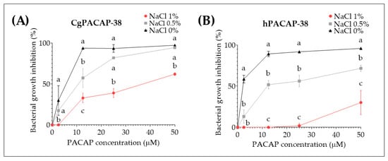Previous research has demonstrated the direct antimicrobial activity of human PACAP-38 and variants [2] and of synthetic C. gariepinus PACAP-38 against gram-negative and gram-positive bacteria of biomedical and aquaculture importance [5,6]. In the present study, synthetic C. gariepinus PACAP-38 and human PACAP-38 were assessed for their direct antimicrobial activity against a 2018 isolate of the bacterial pathogen Y. ruckeri. Fish PACAP-38 had moderate direct antibacterial activity against Y. ruckeri when selective TSB was used. It was able to inhibit up to 60% of the bacterial growth only at the higher concentrations assayed (from 50 to 100 µM), while human PACAP was ineffective against Y. ruckeri in the same conditions. These results are different from those obtained by Lugo et al. [5] using LB media. These authors found 100% inhibition of bacteria growth using 50 μM of synthetic CgPACAP-38 against Yersinia ruckeri strain 4319/03, which suggests that PACAP direct antimicrobial activity depends on the media and strain used. Both CgPACAP-38 and hPACAP-38 had a significant enhancement of their direct antimicrobial activity against Y. ruckeri in the complete absence of NaCl salt in LB media. They inhibited bacterial growth by more than 90%, from 12.5 μM to the highest concentration of 50 μM. Previous studies demonstrated lag times and specific growth rates for bacteria with gradients of different pH, temperature, and salt concentrations [36,37,38], and those parameters can also affect the effectiveness of the antimicrobial compounds in a dose-dependent manner. For instance, the microbicidal activity of recombinant human intestinal defensin 5 (rHD-5) against Salmonella typhimurium was reduced in the presence of salt, and its activity was abolished at 100 mM NaCl. However, at all salt concentrations tested, rHD-5 remained bactericidal to Listeria monocytogenes [39].