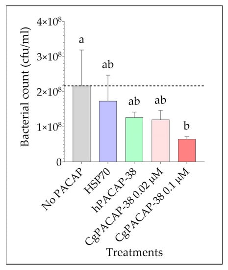 We next assessed the impact of PACAP on bacterial growth after infection with Y. ruckeri using the RTS11 cell line as an in vitro model. RTS11 cells were exposed to different PACAP concentrations 24 h prior to infection, and bacteria in the culture supernatant were quantified three days post-infection (day 4 after PACAP exposure). We observed that only the treatment with the higher dose of CgPACAP-38 tested (0.1 μM) was able to significantly decrease the bacterial count (cfu/mL) in the supernatant of RTS11 exposed to Y. ruckeri (p < 0.05) (Figure 6). There was not a significant impact of either a lower dose of CgPACAP-38, hPACAP-38, or an HSP70 control peptide on the number of viable bacteria in the cell culture supernatant (p > 0.05).