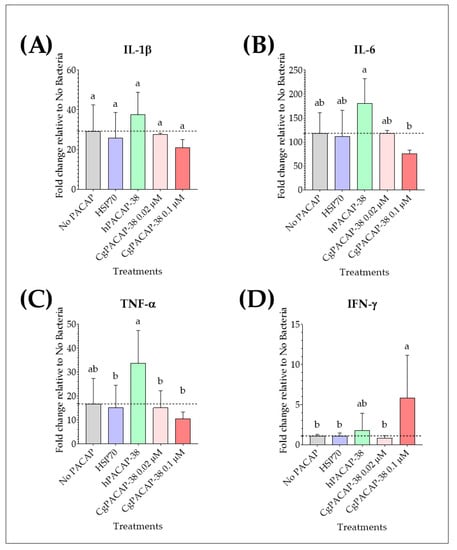 Relative expression levels of pro-inflammatory cytokines in RTS11 cells during live infection with Yersinia ruckeri (MOI of 0.001) after PACAP pre-treatment. RTS11 cells were pre-treated with CgPACAP-38 (0.02 and 0.1 μM), 0.1 μM of hPACAP-38, or 0.1 μM of HSP70 peptide 24 h before exposure to Y. ruckeri, and the relative expression levels of IL-1β (A), IL-6 (B), TNF-α (C), and IFN-γ (D) were analyzed on day 3 post-infection (day 4 after PACAP treatment). Relative expression was determined following the 2−ΔΔCT method, and EF-1α was used as the reference gene. Data is expressed as fold change relative to the expression level in the No Bacteria group and was represented as the mean ± SD of 3 experimental replicates. Differences among treatments were considered to be significantly different when compared to the No PACAP control (RTS11 exposed to Y. ruckeri, dashed line) by a one-way ANOVA followed by a Fisher’s least significant difference (LSD) post-hoc test. Different lowercase letters represent statistically significant differences at p < 0.05. The significance of the letters is indicated in Supplementary Table S5.
