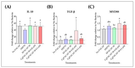Relative expression levels of anti-inflammatory cytokines and immune signal transduction genes in RTS11 cells during live infection with Yersinia ruckeri (MOI of 0.001) after PACAP pre-treatment. RTS11 cells were pre-treated with CgPACAP-38 (0.02 and 0.1 μM), 0.1 μM of hPACAP-38, or 0.1 μM of HSP70 peptide 24 h before exposure to live Y. ruckeri, and the relative expression levels of IL-10 (A), TGF-β (B), and MYD88 (C) were analyzed on day 3 post-infection (day 4 after PACAP treatment). Relative expression was determined following the 2−ΔΔCT method, and EF-1α was used as the reference gene. Data is expressed as fold change relative to the expression level in the No Bacteria group and was represented as the mean ± SD of 3 experimental replicates. Differences among treatments were considered to be significantly different when compared to the No PACAP control (RTS11 exposed to Y. ruckeri, dashed line) by a one-way ANOVA followed by a Fisher’s least significant difference (LSD) post-hoc test. Different lowercase letters represent statistically significant differences at p < 0.05. The significance of the letters is indicated in Supplementary Table S6.