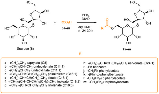 SEs (7a–m) were synthesized using a modified Mitsunobu procedure [31] starting from sucrose (6) and various saturated or (poly)unsaturated fatty acids, or alkyl aromatic/aromatic acids (3) (Scheme 2). This optimized reaction gave preferentially the esterification at 6-OH of sucrose and proceeds with a sucrose/fatty acid 1:1.5 molar ratio using 2.5 equivalents of triphenylphosphine (PPh3) and diisopropyl azodicarboxylate (DIAD) in dry dimethylformamide (DMF) at room temperature for 24–30 h [32,33]. The procedure gave the corresponding 6-O-sucrose esters in moderate yields. However, it is worth mentioning that this reaction was found to be versatile for all the acid substrates (particularly aromatic acids).