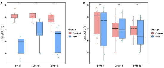 Colonization levels of C. jejuni in the cecal contents of broiler chickens following direct infection (FMT trial 1, (A)) or seeder bird infection (FMT trial 2, (B)) models. Each dot represents the log10 transformed CFU/g feces from an individual chicken. The mean values (for 8 birds in each group/DPI in panel (A) and 10 birds for each group/DPM in panel (B)) are shown as the middle horizontal lines, and the vertical lines stretching out from the means represent the 95% confidence intervals (CI). The red dots and blue triangles on the plots represent individual sample’s log10 transformed CFU data from the control and the FMT groups. DPI, day post inoculation with C. jejuni; DPM, day post mingling after the introduction of the seeder birds colonized with C. jejuni. The p-values were calculated using the non-parametric Wilcoxon test (*** p-value < 0.001, ** p-value < 0.01; ns: not significant).