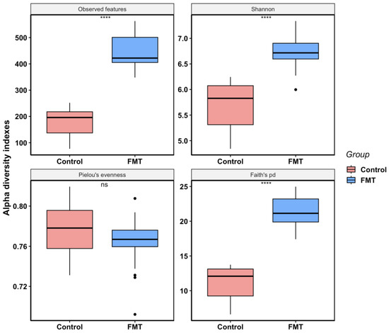 Box plots for alpha diversity metrics (observed features, Shannon, Pielou’s evenness, and Faith’s pd) comparing FMT and control samples in FMT trial 2. Each box shows the combined data from the entire experiment within each group. Horizontal bars inside boxes mark the mid-point of the data. The upper and lower vertical bars represent data values outside the middle 50%. The p-values were calculated using a non-parametric Wilcoxon test (**** p-value < 0.0001; ns: not significant).
