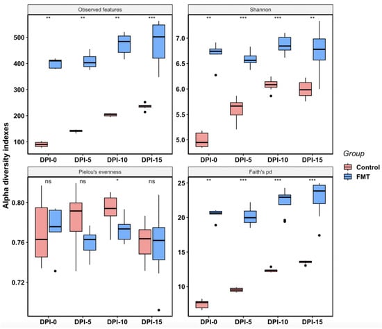 Box plots for alpha diversity metrics (observed features, Shannon, Pielou’s evenness, and Faith’s pd) comparing FMT and control samples from DPI-0, DPI-5, DPI-10, and DPI-15 in FMT trial 1. Each box shows the combined data from a particular sampling event (DPI, day post inoculation) within each group. Horizontal bars inside boxes mark the mid-point of the data. The upper and lower vertical bars represent data values outside the middle 50%. The p-values were calculated using the non-parametric Kruskal–Wallis test (*** p-value < 0.001, ** p-value < 0.01, * p-value < 0.05; ns: not significant).