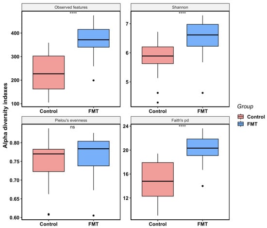 Box plots for alpha diversity metrics (observed features, Shannon, Pielou’s evenness, and Faith’s pd) comparing FMT and control samples in FMT trial 1. Each box shows the combined data from the entire experiment within each group. Horizontal bars inside boxes mark the mid-point of the data. The upper and lower vertical bars represent data values outside the middle 50%. The p-values were calculated using a non-parametric Wilcoxon test (**** p-value < 0.0001; ns: not significant).