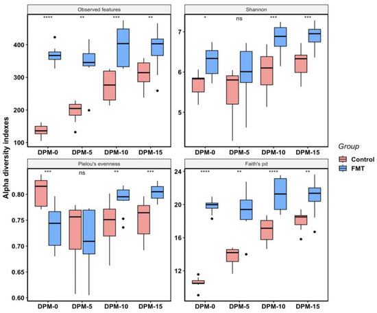 Box plots for alpha diversity metrics (observed features, Shannon, Pielou’s evenness, and Faith’s pd) comparing FMT and control samples from DPM-0, DPM-5, DPM-10, and DPM-15 of FMT trial 2. Each box shows the combined data from a particular sampling event (DPM, day post mingling) within each group. Horizontal bars inside boxes mark the mid-point of the data. The upper and lower vertical bars represent data values outside the middle 50%. The p-values were calculated using the non-parametric Kruskal–Wallis test (**** p-value < 0.0001, *** p-value < 0.001, ** p-value < 0.01, * p-value < 0.05; ns: not significant).