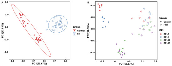 Principal coordinate analysis (PCoA) plots based on weighted UniFrac distances for FMT trial 1. The FMT and control populations were grouped by treatment status (A) or by treatment status and sampling times (B). The PC1 axis depicts 55.67% of the total variance, and the PC2 axis shows 12.83% of the total variance. Each dot represents microbiota composition in a single sample. Each ellipse was drawn at a 95% confidence level to include most samples in either group (A). DPI: day post inoculation.