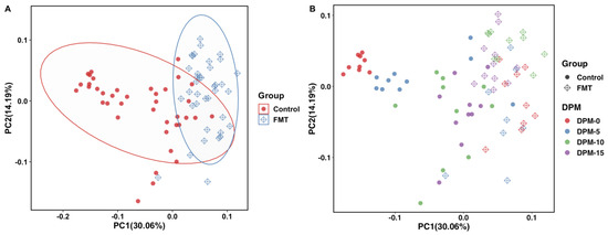 Principal coordinate analysis (PCoA) plot based on weighted UniFrac distances for FMT trial 2. The FMT and control populations were grouped by treatment status (A) or by treatment status and sampling times (B). The PC1 axis depicts 30.06% of the total variance, and the PC2 axis shows 14.19% of the total variance. Each dot represents microbiota composition in a single sample. Each ellipse was drawn at a 95% confidence level to include most samples in either group (A). DPM: day post mingling.