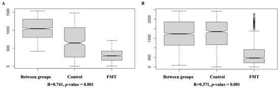 ANOSIM was also conducted to confirm the results from the beta diversity analysis described above. For FMT trial 1, the overall microbiota structure was significantly different between the FMT group and the control group (R = 0.741, p-value = 0.001) (Figure 8). In addition, the dissimilarity of the cecal microbiomes between the two groups was much greater than the dissimilarity within each group (Figure 8A). For FMT trial 2, even though the dissimilarity between groups was still significantly higher than that within the FMT group (R = 0.371, p-value = 0.001), it was at a similar level to that within the control group (Figure 8B). ANOSIM tests further revealed that the dissimilarity in the gut microbiota composition within the FMT group was considerably lower than that within the control group for both FMT trials, as the FMT groups had lower dissimilarity rank values compared with the control groups (Figure 8).