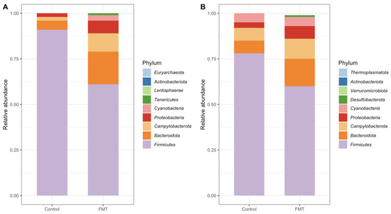 Stacked bar plot representations of the main taxa’s relative abundances at the phylum level for FMT trial 1 (A) and FMT trial 2 (B). Values represent combined data across all time points for each group/trial. The abundances of Tenericutes (0.37%) and Actinobacteriota (0.18%) in the control group were insufficient to be visually represented in Figure (A). Likewise, the abundances of Actinobacteriota (0.09%), Desulfobacterota (0.07%), and Verrucomicrobiota (0.03%) in the control group were insufficient to be visually represented in Figure (B).