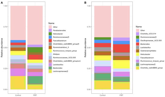 The top 10 abundant genera of the control and the FMT groups for both trials are shown in Figure 10 and Tables S3 and S4. For FMT trial 1, the most abundant genera were Bacteroides (9.63%), Helicobacter (7.79%), and Faecalibacterium (6.60%) in the FMT group, while an unknown genus of Lachnospiraceae(f) (16.21%), Lactobacillus (8.62%), and Clostridiales_vadinBB60_group(un) (5.54%) were the most abundant in the control group (Figure 10A). For FMT trial 2, the most abundant genera were Helicobacter (10.35%), Bacteroides (9.60%), and Clostridia_vadinBB60_group (9.29%) in the FMT group, while Clostridia_vadinBB60_group (10.79%), Lachnospiraceae(f) (8.69%), and Ruminococcus_torques_group (7.82%) were the top three genera in the control group (Figure 10B).