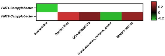 Heat map showing Pearson’s correlation coefficients for Campylobacter abundance and other abundant genera abundances at the genus level for both FMT trials. Not applicable is shown in white. Coefficients range from −1 to 1, with 1 representing the highest positive correlation and −1 representing the highest negative correlation. Significant correlations are colored in red (positive) or green (negative) hues. Correlations that were not significant are not shown in the plot.