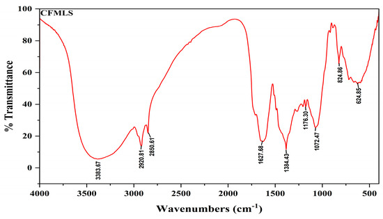 FT-IR chromatogram showing peak values for bioactive functional groups of C. felina methanolic leaves extract.