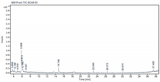 The methanolic leaves extract of C. felina were investigated for volatile phytochemical composition by GCMS analysis and were confirmed by NIST library mass spectrum. In total, 12 different phyto-compounds were identified in the leaves, and methanolic extract are of important applications. The retention time, peak area, area percent, name of the compound, molecular formula, and molecular weight are separately depicted for each identified phyto-compound in Figure 4 and Table 5. The phyto-constituents with high-percent composition were found to be 1-Butanol, 3-methyl-, formate (48.79%); 1-Decanol, 2-ethyl- (13.40%); 1,6-Anhydro-β-d-talopyranose (12.49%); Ethene, 1,2-bis(methylthio)- (7.22%); and Decane (4.02%), while considerable-percent composition of phyto-compounds detected were 3-Methylene-7, 11-dimethyl-1-dodecene (3.085); Amlexanox (2.50%); 1,2,3,4-Cyclopentanetetrol, (1α,2β,3β,4α) (2.07%), L-Cysteine S-sulfate (1.84%); n-Hexadecanoic acid (1.70%); Flucarbazone (1.55%); and 4-Bromo-2, 6-difluorobenzyl alcohol (1.35%). Each identified compound is specific for biological activities and is a specific role of metabolite.