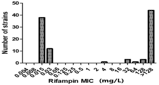 Distribution of rifampin (RIF) minimum inhibitory concentrations (MICs) for 52 RIF-R MRSA isolates. Of the 52 isolates, 51 (98.1%) showed high-level RIF resistance (MIC ≥ 8 mg/L), and only 1 (1.9%) had low-level RIF resistance (MIC 4 mg/L). Additionally, the broth microdilution method was used to determine the MIC distributions of 50 RIF-susceptible MRSA isolates.