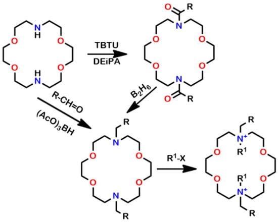Figure 1 shows the chemical structures and preparation of the compounds that were used in the study. 4,13-Diaza-18-crown-6 was alkylated and reduced or the sidearms were attached by reductive amination. The bacterium we call E. coli tetR was prepared in our laboratory and has a MIC against tetracycline of 1000 µM [51].