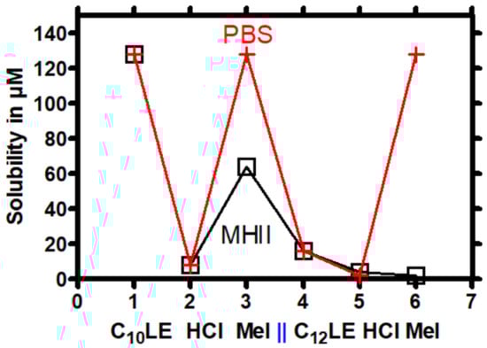 As expected from published data [56], verapamil hydrochloride was soluble in water as well as in media, while reserpine was soluble only at 16 µM in both PBS and MHII. We surveyed both the HCl and MeI salts of C10LE (1) and C12LE (4). As shown in Table 2, the methyl iodide (MeI) salts of C10 and C12 lariat ethers showed greater solubility in PBS than do the corresponding HCl salts. The free base form of C10LE (1), was more soluble in both PBS and MHII than was C12LE (4). This was expected, since C10LE (1) contains four fewer carbons than C12LE (4). It is interesting to note that the solubilities of methiodide salts 3 and 6 were greater in PBS than in MHII. Although MHII is a more complex medium than phosphate-buffered saline, the solubilities showed a similar profile except for C12LE•2MeI (6). Figure 2 shows the data of Table 2 in graphical form.