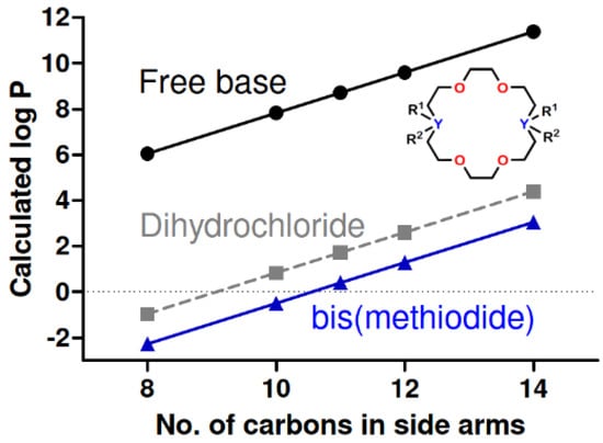 Figure 3. Calculated log P octanol–water partition coefficients for C8, C10, C11, C12, and C14 lariat ethers. For the free bases, R1 = H, R2 is absent and Y = N. For the dihydrochlorides, R1 = R2 = H and Y = N+. For the methiodides, R1 = H, R2 = CH3, and Y = N+.