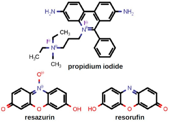 Figure 4. The chemical structures of propidium iodide and the resazurin–resorufin pair.
