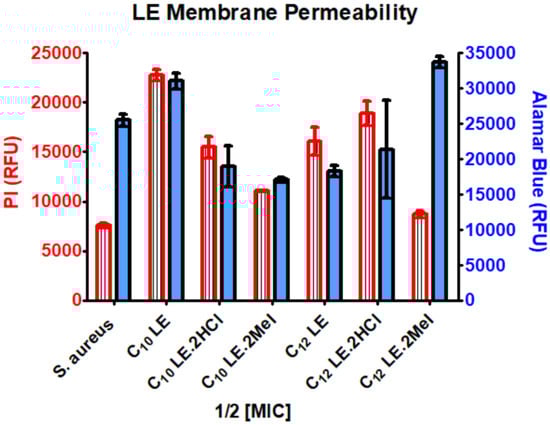 Figure 5. Assay of membrane permeability and vitality of S. aureus in the presence of 16 administered at ½ MIC. Increase in PI fluorescence (red striped bar)/membrane penetration into S. aureus. The blue bars represent survival assayed by the alamar blue test. Error bars represent the standard deviation in three independent trials.