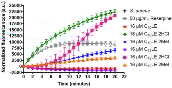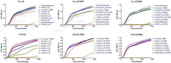 In the studies above, 16 were administered at ½ MIC concentrations. At these concentrations, no toxic effect of the compound on cells was anticipated. In order to confirm the effect of compound concentration on S. aureus viability, growth curves were conducted for each compound. In all cases, S. aureus alone was used as control. For the three C10LE compounds (13), 32 µM and 64 µM concentrations of norfloxacin were added to the norfloxacin-resistant S. aureus strain as an additional control. The concentration ranges for each of compounds 16 varied with their potencies.