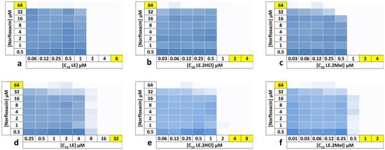Figure 7. Checkerboard experiments with 16 in combination with norfloxacin against S. aureus 1199B. The results are the average of three trials. Data represent the average inhibition of growth for three trials. Shades of blue color indicate growth whereas a white color indicates inhibition of growth > 90%. (a) C10LE, 1; (b) C10LE,2HCl, 2; (c) C10LE.2MeI, 3; (d) C12LE, 4; (e) C12LE.2HCl, 5; (f) C12LE.2MeI, 6.