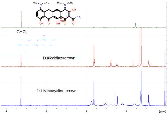 Figure 9. NMR stack plot showing the NMR spectrum of minocycline hydrochloride in CDCl3 (top), C10LE in CDCl3 (center), and both crown and drug dissolved in CDCl3 in a 1:1 ratio (within experimental error).