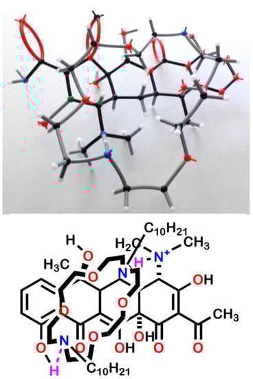 An examination of the numerous NMR experiments showed that the most prominent changes in the spectra occurred in the signals proximate to the macro ring nitrogen atoms. The inference drawn from this was that hydrogen bonding facilitated by tetracycline’s hydrochloride was providing a primary link between drug and crown. It should be noted that the tetracycline family of molecules, although represented in line-angle drawings as four fused linear rings, actually are bent. Figure 10 shows the structure of tetracycline hydrochloride rendered in the space-filling representation from the CCSD structure (XAYCAB) [61] using Mercury software v15.6.29.0.