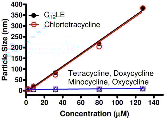 It is known that dialkyldiazacrowns form stable aggregates in aqueous solution [57,62]. It was hypothesized that complexation between antimicrobials and macrocycles would alter or prevent the ability of the complex to form aggregates. The graph of Figure 12 shows the results of dynamic light scattering for C12LE (4) in water along with the combinations of the crown and the five tetracycline derivatives. Of the five tetracyclines studied, only chlortetracycline hydrochloride failed to complex with C12LE (4). The graph clearly shows that aggregation was completely impeded by all of the tetracyclines except for chlortetracycline hydrochloride. Indeed, the particle sizes observed when chlortetracycline is present was almost indistinguishable from particle formation by C12LE (4) alone.