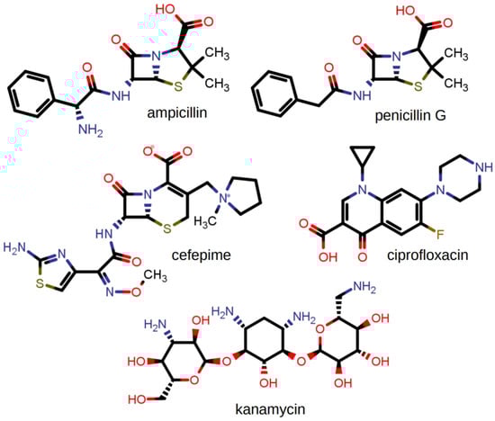 Figure 13. Chemical structures of ampicillin, penicillin G, cefepime, ciprofloxacin, and kanamycin. Dynamic light scattering and complexation data are shown in Figure 14.