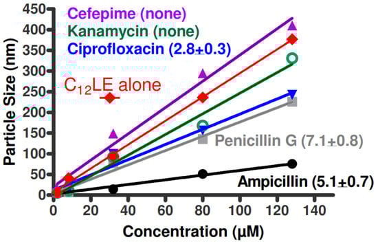 Neither cefepime nor kanamycin showed complexation with C12LE (4) when studied in the NMR extraction experiment. The lack of interaction was confirmed by the fact that C12LE aggregation showed the highest slopes: 3.2 for cefepime and 2.5 for kanamycin. The average of these was 2.85, which differed from the slope of C12LE (4) alone of 2.95 (not shown on Figure 14). For the remaining three compounds, ampicillin, penicillin, and ciprofloxacin, the shallower slopes indicated an effect on aggregation that diminished the ability of C12LE (4) to form large particles.