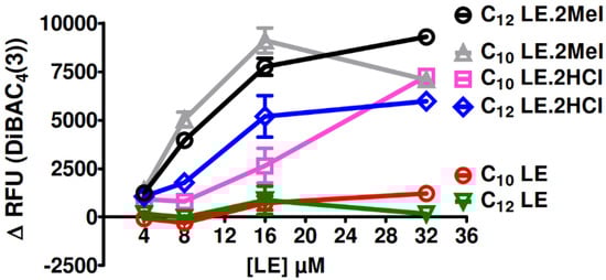 Based on the experimental results described herein, C10LE•2HCl (2) and the corresponding MeI salt are good candidates to study further. The C10LE•2HCl (2) had good solubility and was not affected by changes in the pH. It also penetrated membranes and depolarized them enough to inhibit efflux pump activity, but growth was not inhibited (growth curves). As such, it is a promising adjuvant that can be used in combination with antibiotics that are losing efficacy as a result of efflux pump-related resistance. This was shown with the combination studies and the 1:1 interaction of LEs with antimicrobials. It is of further interest that the cytotoxicity of the MeI salts (separation index of 32-fold) was lower than that of HCl salts (separation index of only 8-fold), making them both strong candidates for further development.