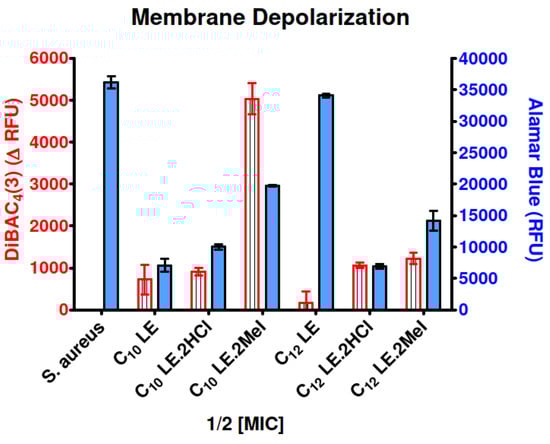 A second series of experiments was performed to determine the relationship of disrupted ion homeostasis, as reflected in membrane depolarization [65] with cellular vitality (Figure 17). In this case, S. aureus was confronted by each of 16 at ½ MIC. Alamar blue (see above) was used to determine cell viability [66]. No depolarization was apparent in the S. aureus control in the absence of a lariat ether or lariat ether derivative. Depolarization was greatest for C10LE•MeI (3). Similar levels of depolarization were observed for 1, 2, 5, and 6. Only C12LE (4) failed to show any significant evidence of membrane depolarization. As shown in Table 3 (above), 4 showed the lowest potency (highest MIC) against S. aureus. We note that the MIC values for S. aureus observed for 2, 3, 5, and 6 were similar.